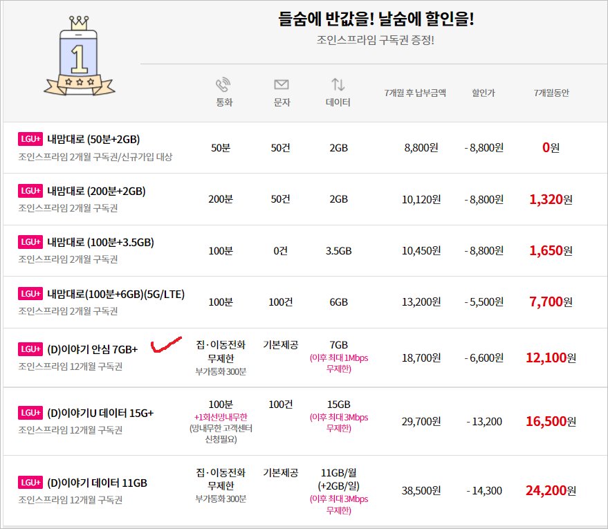 이야기안심 7GB 전화무제한 / 문자 기본제공 데이터 7GB 12100원 요금제
