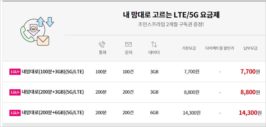 LGU+ 내맘대로 요금제 여러가지 있습니다. LGU+ 약간 저렴한 편이죠