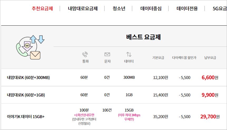 베스트 요금제 나와 있습니다. 100분 100건 15GB 29700원 데이터 사용량 및 통화량에 따라 선택 하면 될지 싶습니다.