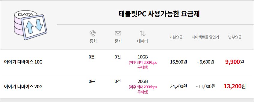 주로 데이터 사용량이 많으므로 태블릿 요금제 10GB 9900원 , 20GB 13200원 나와 있습니다.