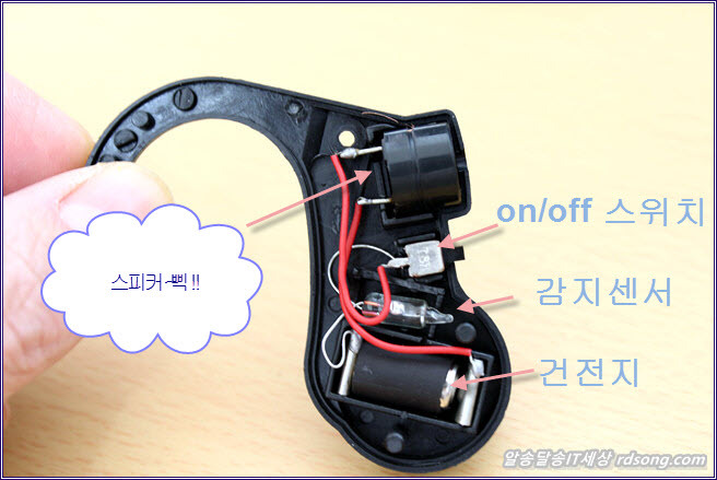 중국산 제품이긴 한데 우선 어떤 원리인지 궁금해서 분해를 해 보니 ,삑소리를 내는 스피커 있고 건전지 있고, 감지센서가 하나있고 파워 on/off 존재 하며 감지센서 유리안에 쇠구슬인지 뭔지 뵈는데 이것이 굴러다니면서 접점 되거나 떨어졌을 때 소리를 내게 되어 있습니다