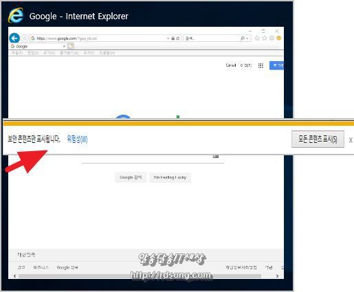 익스플로러 11 보안콘텐츠만 표시 됩니다 모든 콘텐츠 표시 팝업창 없애기, 안뜨게 만들기