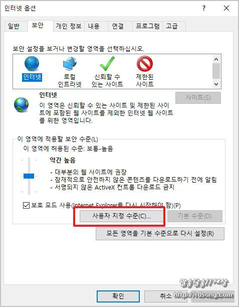 상단의 보안 탭에서 보호 모드 사용 하단의 [ 사용자 지정 수준 ]을 클릭 하여 들어 갑니다
