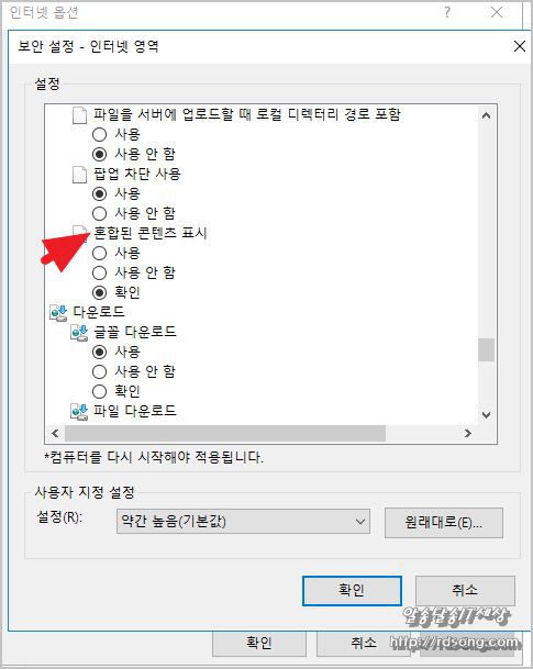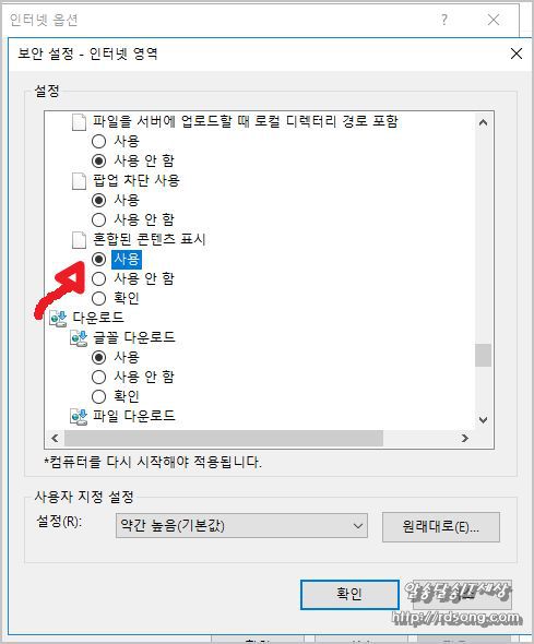 혼합된 콘테츠 를 [사용]으로 선택해 주고 확인 적용을 하면 됩니다