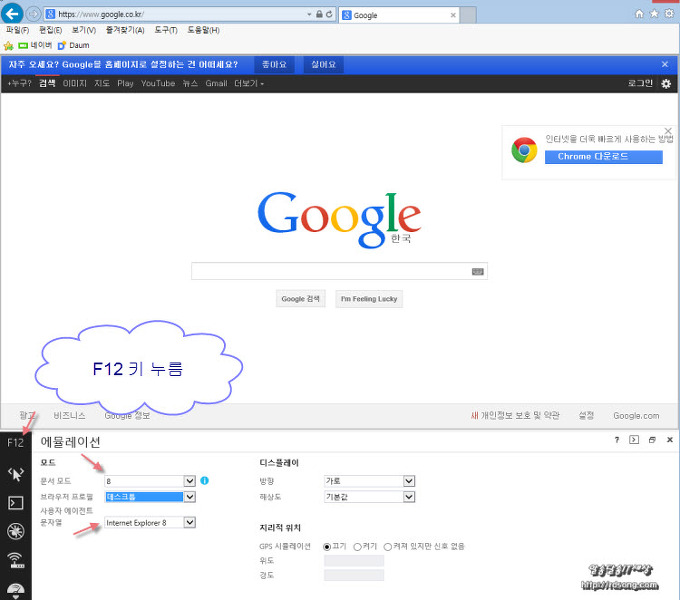 익스플로러11 내가 원하는 익스플로러 버젼인 IE10 IE9 IE8 IE7 모드로 쉽게 사용을 할수 있는 방법은 아주 간단한데요 F12 키를 눌러 개발자 모드에서원하는 익스플로러 모드로 전환해서 쓸수 있습니다