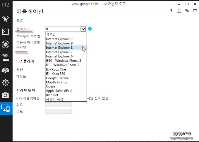 에뮬레이션 모드에 문서모드와 문자열이 나타나는데요 이 두 필드값을 원하는 익스플로러 버젼 , 문서모드는 8 , 문자열은 internet Explorer 8 을 선택하면 익스8 모드로 쓸수 있는 겁니다