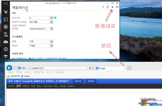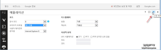 고정해제를 누르면 웹페이와 개발자모드 에뮬레이션이 딱 분리가 됩니다 웹페이지 하단에 걸리적 거린다면 분리해서 쓰면 되는데요 백그라운드로 열린 상태로 사용해야 합니다 현재 보고 있는 메인 창을 닫아 버리면 사용중인 모드 역시 사라집니다 그러므로 익스11 다시 띄워서 F12키 눌러서 다시 설정해야 합니다