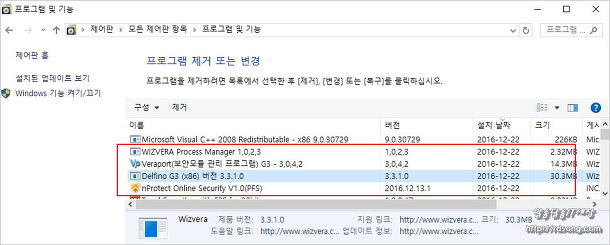 프로그램 제거 또는 변경 에 가보니 예전에 말하는 액스브엑스를 이름만 바꿔서 보안프로그램이라 칭하는 것들인데 설치날짜를 유심히 살펴 보면 뭐가 추가되어 설치가 되었는지 바로 파악할수 있다