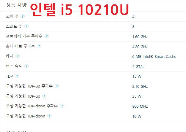 인텔 코어 i5-10210u 프로세서 코어수 4개 스레드 8개 되는 cpu 1.6Ghz 이며 최대 4.2Ghz 지원 됩니다. 인텔 UHD 그래픽 탑재 되어 있습니다.