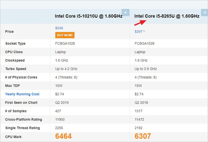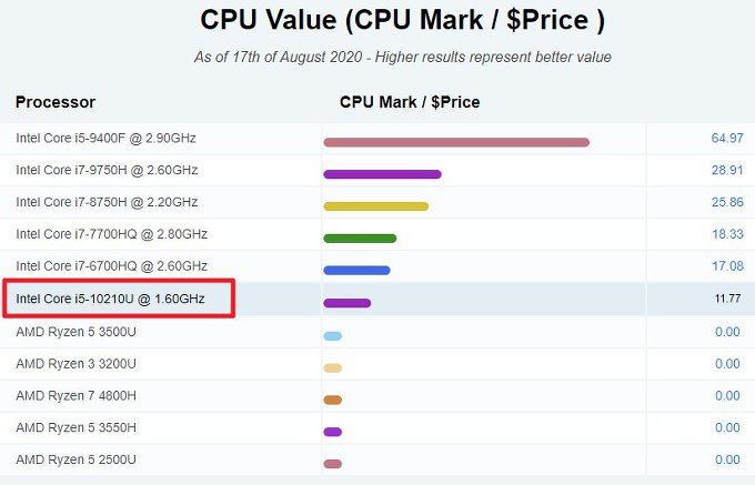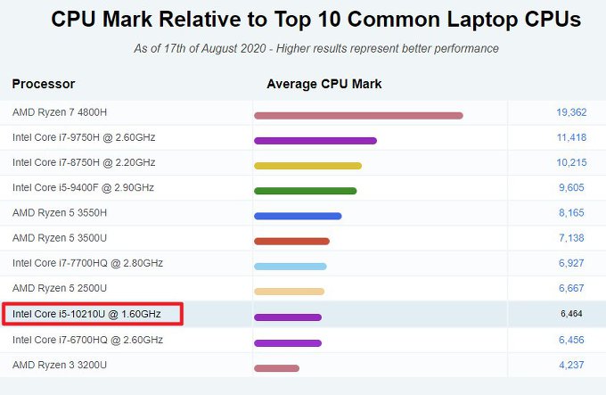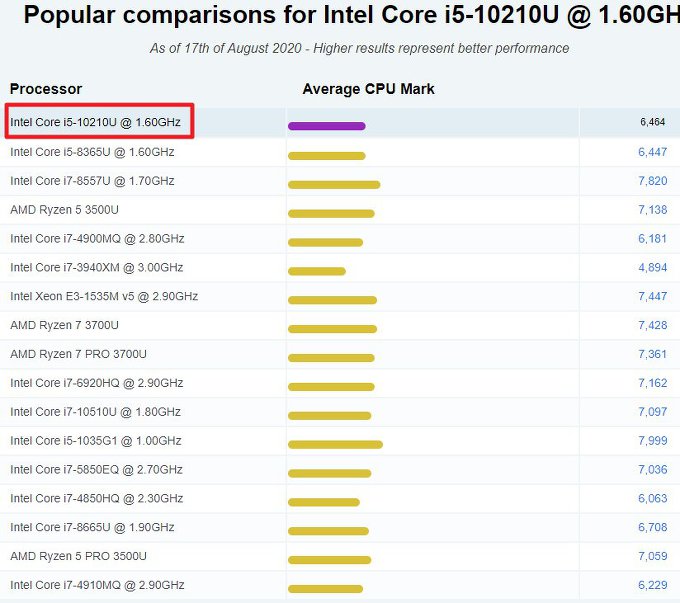 intel core i5-10210u 1.6Ghz CPU 벤치마크에서 Top10 랩탑/노트북용 cpu 프로세서 비교 해 놓은 것을 보면 인텔10세대 cpu 제품 중에 하위에 머물러 있죠.