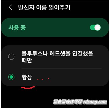발신자 이름 읽어주기 ON 켜주면 됩니다. 간단합니다. 그런데 텍스트 글자를 터치 해 서 보면 2가지 옵션설정 가능 합니다.