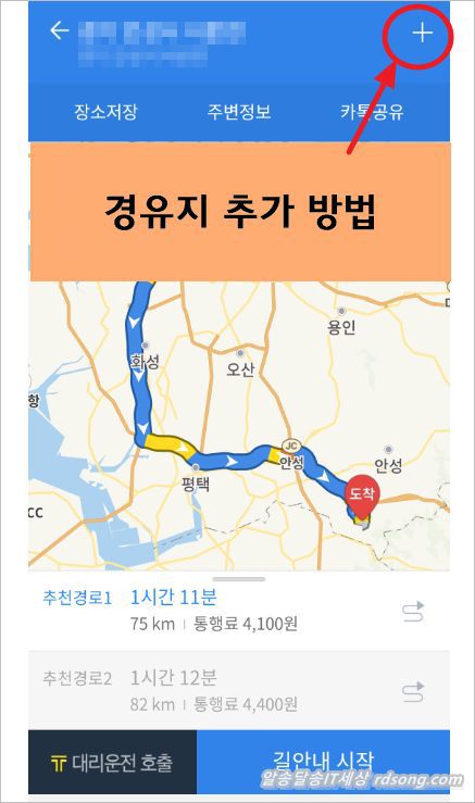 사실 자주 활용하지는 않지만 경유지 추가 하는 기능 알아 두면 언젠가 사용 한다. 상단의 + 터치하면 경유지를 추가 할수 있다.