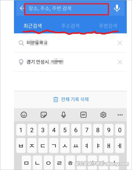 아래 보면 중간에 경유지 추가 되어 있고, 경유지 제거 하려면 – 터치 하면 된다.