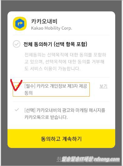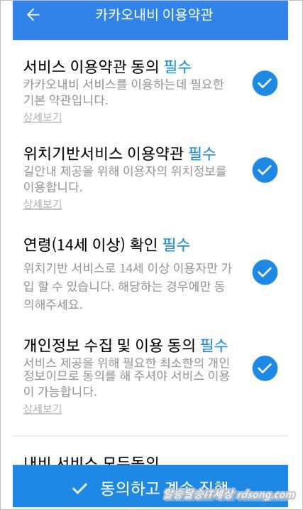 카카오내비 필수 개인정보만 동의 하면 된다. 선택은 제외.