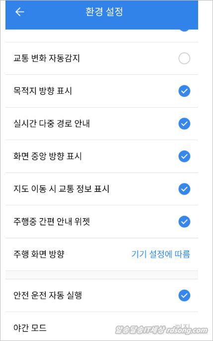환경 설정 부분에서는 그다지 사용자가 옵션을 설정 할 부분이 별로 없는데 교통변화 자동 감지 기능 OFF , 이유는 주행하다가 경로 바뀌므로 상당히 불편하여 껐다.