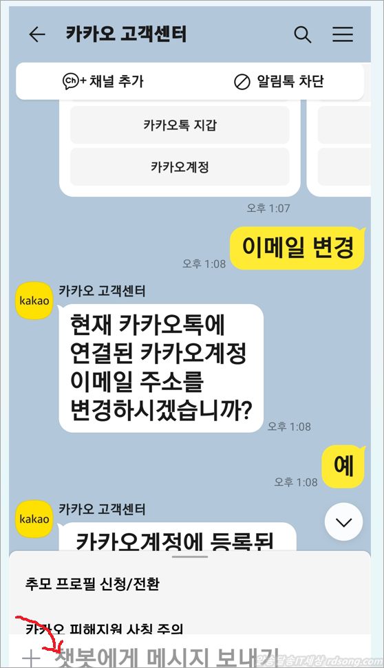 카카오 계정 변경 방법 챗봇에게 문의 하여 순서대로 진행 하면 변경 할수 있습니다.