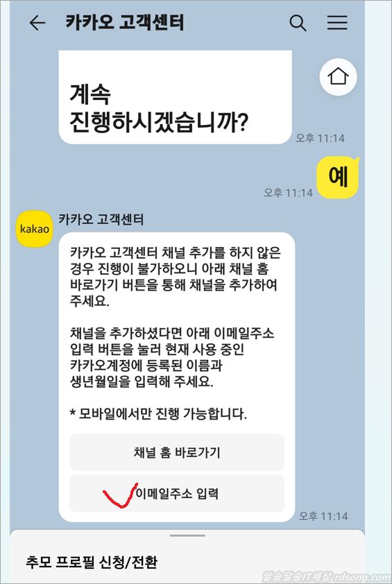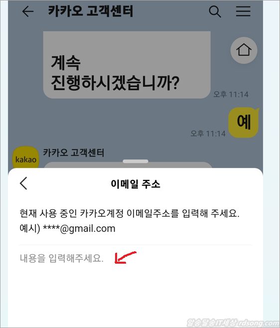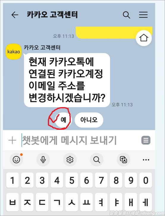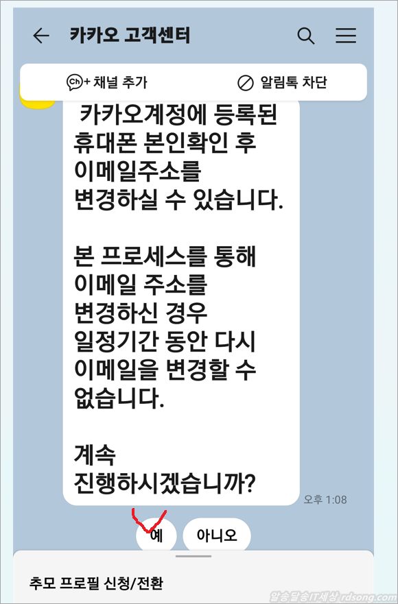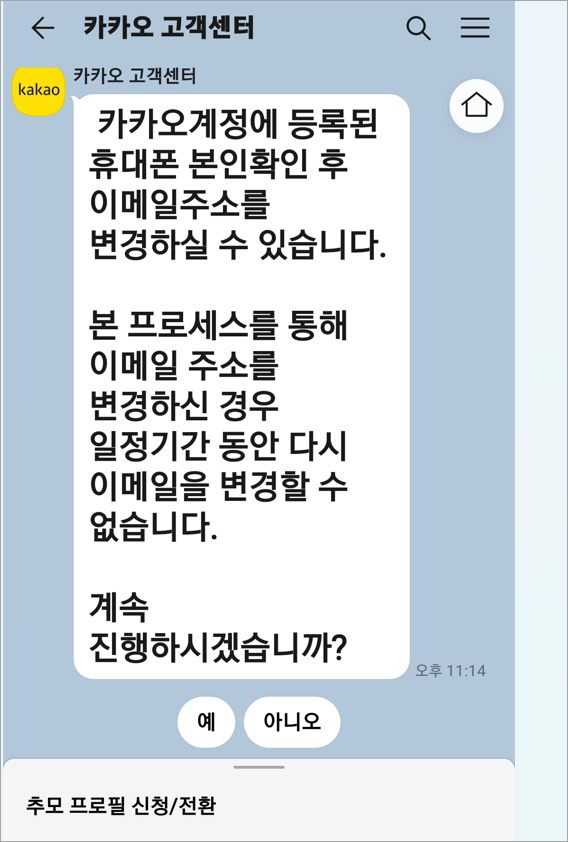 현재 카카오톡 연결 된 카카오계정 이메일 주소 변경 하겠습니까? 그려 변경 할 것이여..
