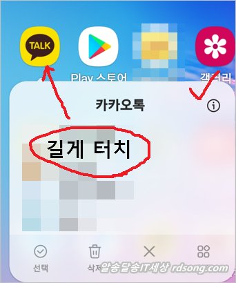 카카오톡 어플 앱을 길게 터치 해 봅니다 그러면 일종의 앱 속성이 뜨게 됩니다. 우측 상단의 i 아이콘 터치 하여 들어가 보겠습니다.