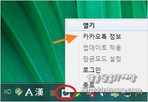 카카오톡 PC 버젼 / 작업표시줄의 카카오톡 이미지 위에 마우스 우측을 눌러 카카오톡 정보를 확인 합니다 , 윈도우7 환경.