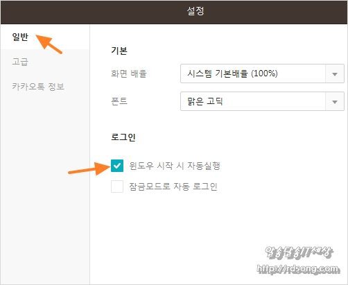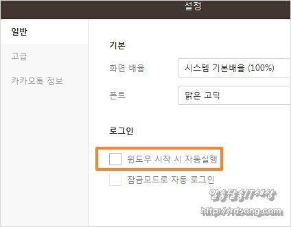 좌측상단의 ‘ 일반 ‘ 에서 확인, 로그인 아래에 보면 ” 윈도우 시작시 자동 실행 ” 에 체크가 되어 있어서 윈도우 부팅할때 마다 카카오톡 프로그램이 실행 됩니다.
