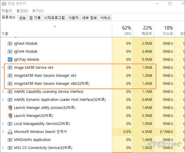사용중이지도 않은 imageSAFER 프로세스가 3개 완전 제거 하기