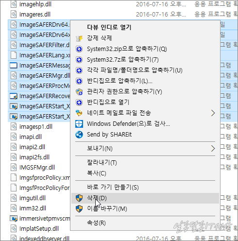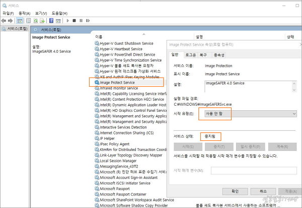 윈도우10 서비스에서 image protect Service 를 중지 시켜 놓으면 바로 위의 image safer 파일들 삭제가 됩니다
