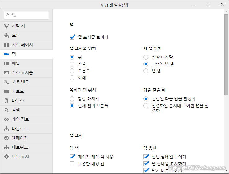 vivaldi 웹브라우저 탭 기능이 상세히 잘 되어 있는데요 기본적으로 건드리지 않고 그대로 사용해도 되는데요 사용자에 맞게 설정해서 쓰면 됩니다