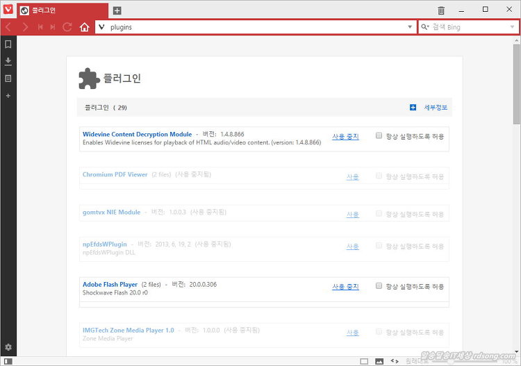 기본적으로 adobe flash player 만 사용하도록 설정하고 그외는 거의 사용중지 하는 것이 브라우져 로딩에 빠르므로 적당히 불필요한 것들은 사용중지를 해서 쓰면 됩니다