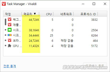 한가지 비발디( vivaldi ) Task Manager 를 열어 보면 메모리 점유율이 상당합니다 컴퓨터의 메모리 소모가 좀 있는 편이라