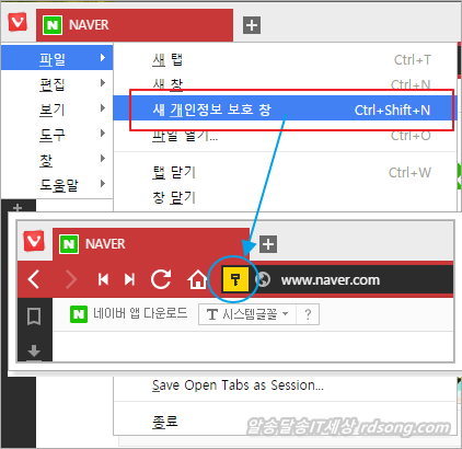 새 개인정보 보호 창 ( ctrl + Shift + N) 을 지원하며 바탕화면에 vivaldi 아이콘의 설정에서 대상에 -inprivate 를 추가하고 저장하면