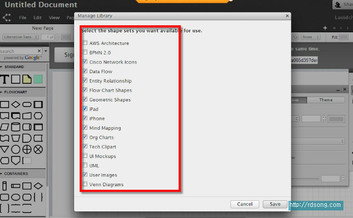 매니지 라이브러리를 추가적으로 지원되는 옵션들을 선택할 수 있는데 flowchart , data flow, ipad, iphone, mind mapping, Tech chart, cisco network icons , Tech clipart, UML 등을 선택하면 좌측에 이미지가 올라 오게 됩니다