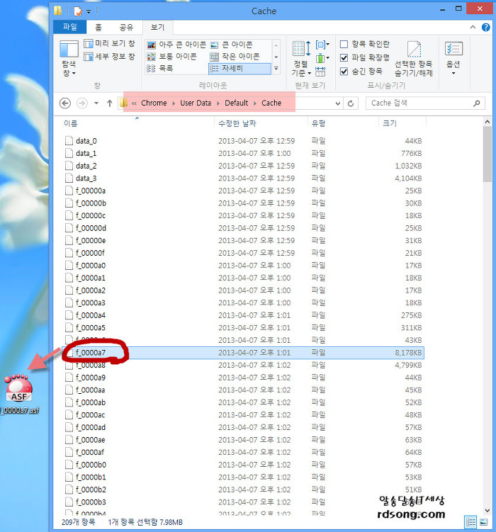 위의 경로가 디폴트 이며 다른 폴더, c: d:의 적당한 폴더를 만들어 놓고 그폴더로 크롬캐쉬 저장 되도록 하는 겁니다 아래 크롬캐쉬파일들을 파일명만 봐서는 판독하기가 어렵네요 영상파일들은 파일확장자도 안나타나고 웹서핑을 하면서 저장된 파일들이 모조리 쌓이게 되는데 우선 확인해보니