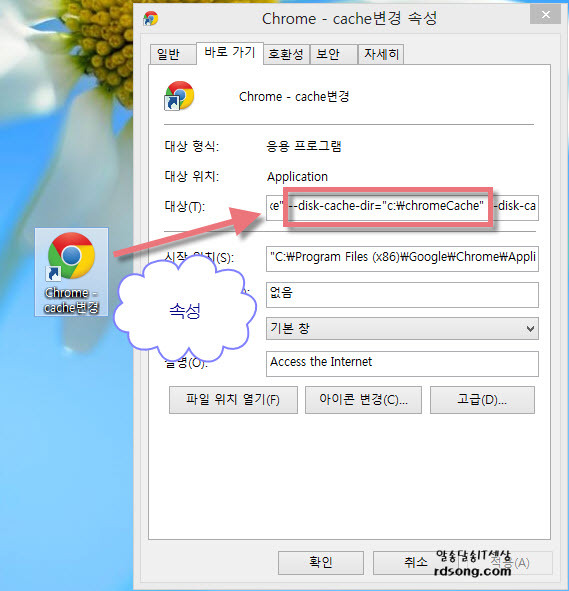 크롬아이콘의 마우스 우측 속성을 눌러서 바로가기 대상(T)에 아래처럼 추가 –disk-cache-dir=”c:chromeCache” 라고 줬내요