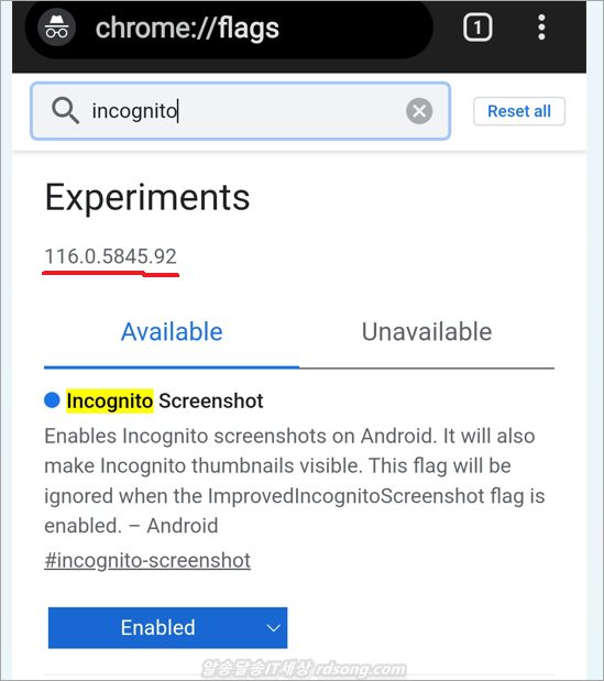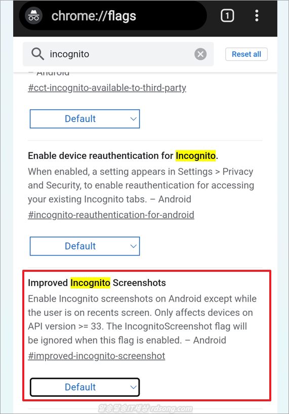 안드로이드 13 핸드폰 사용자는 improved incognito screenshots enabled 적용해서 쓰면 되고, 그 외에는 첫번째 위에 incognito screenshot enabled 한개 적용해서 쓰면 됩니다.