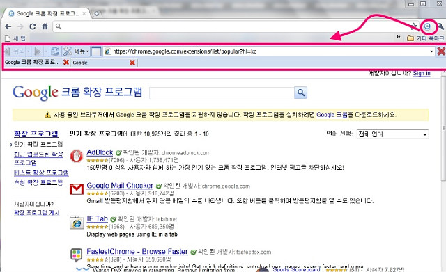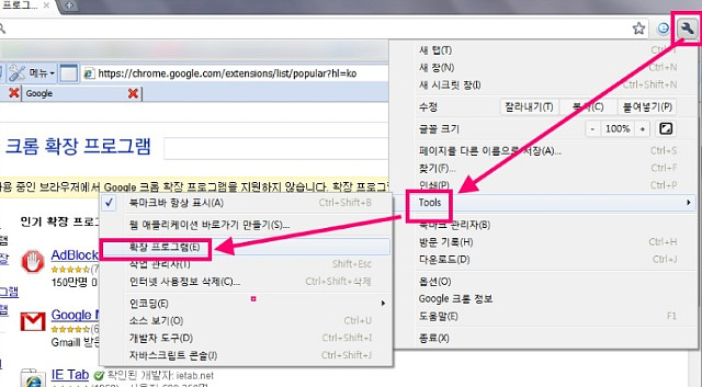 주소창에 직접 타이핑을 해도 되며, 도구-Tools-확장프로그램