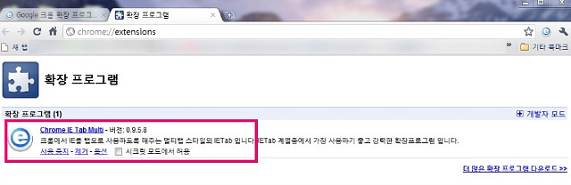 ▲크롬 9 버전 IE 멀티탭 확장 프로그램 설치 된 모습