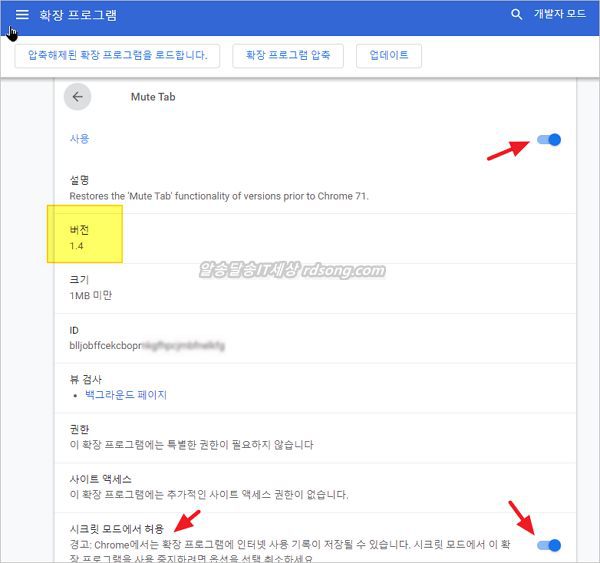 [ 확장 프로그램 관리 ] 에서 크롬 78 시크릿모드에서 작동하도록 스위치를 ON 해 줍니다.