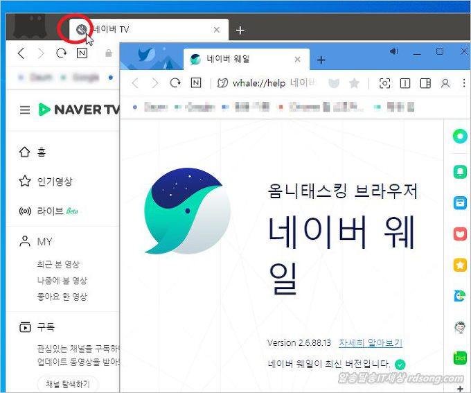 네이버 웨일 브라우저 탭 음소거 소리 끄기 방법