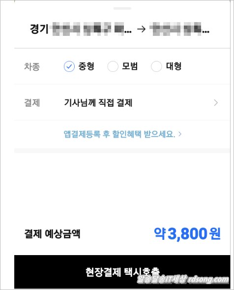 UT 앱 티맵 택시 설치가 되고 내가 가고 싶은 목적지 검색을 하고 나서, 경로확인 > 보면 차종 선택 하는 것도 있고 결제 방식도 기사님께 직접 결제 뜨게 됩니다. 다음에 현장결제 택시 호출 터치 합니다.