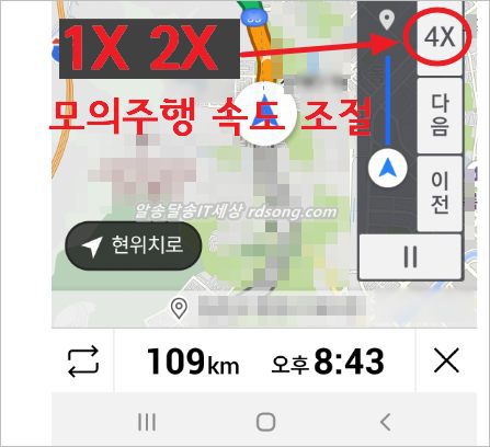 티맵 모의주행 속도, 1배속도, 2배속도, 4배속도 터치하면 변경 되므로 모의주행 속도 조절 됩니다.