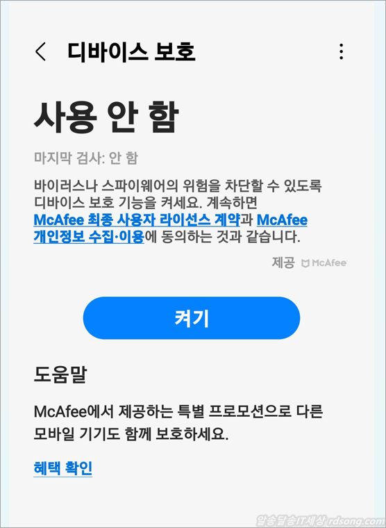 내 핸드폰은 mcafee 꺼져 있는 상태 이다 맥아피 일단 켜면 끄는 부분이 없다고 하는데..! 어떻게 끄지?