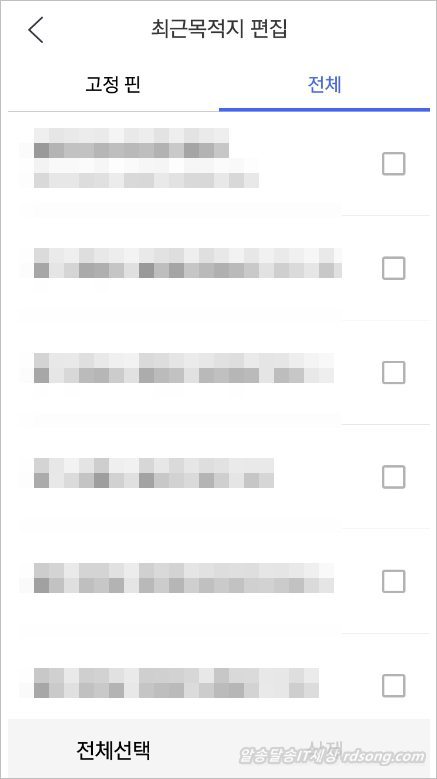 마지막으로 3번을 터치 해 보겠습니다 그러면 최근 목적지 편집으로 나타나며 상단메뉴에 고정핀 또는 전체 선택 하여 티맵 최근 목적지 삭제 할수 있습니다