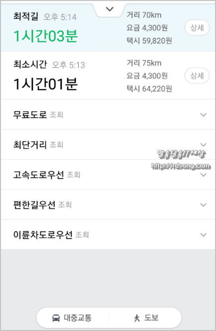 기본적으로 [최적길 ] 주로 사용, 무료도로 및 편한길 우선, 고속도로 우선을 주로 사용을 하는 편이다