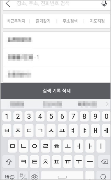 상단의 장소, 주소, 전화번호 검색창을 터치하면 티맵에서 내가 목적지 경로를 검색했던 주소등 나열이 되며 선택하여 검색기록을 삭제할수 있다