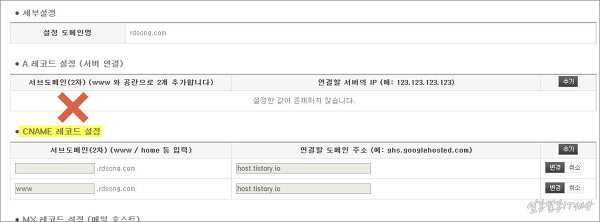 2차 서브도메인을 빈공란(rdsong.com)과 www를 입력하고, 각각 host.tistory.io 라고