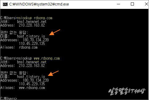 nslookup 2차도메인주소 를 입력하여 이름이 host.tistory.io로 뜨는지 확인 해야 합니다