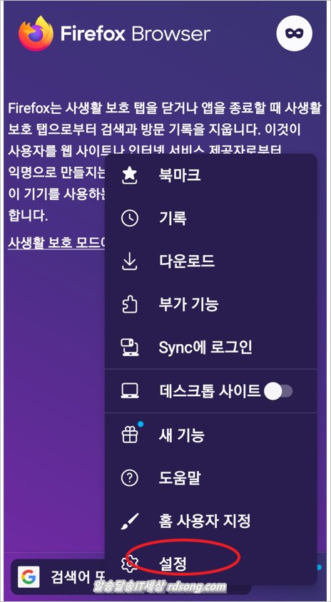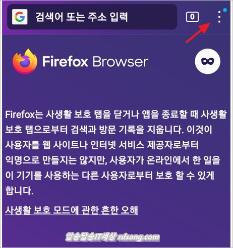 파이어폭스 설정으로 가려면 우측상단의 점3개 터치 합니다.
