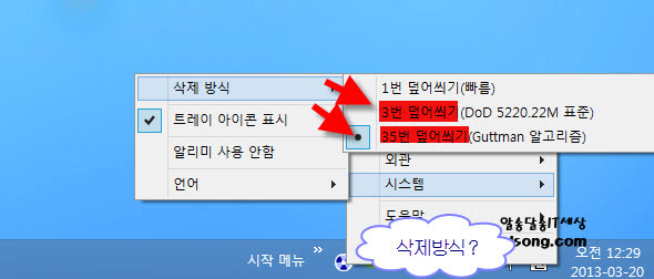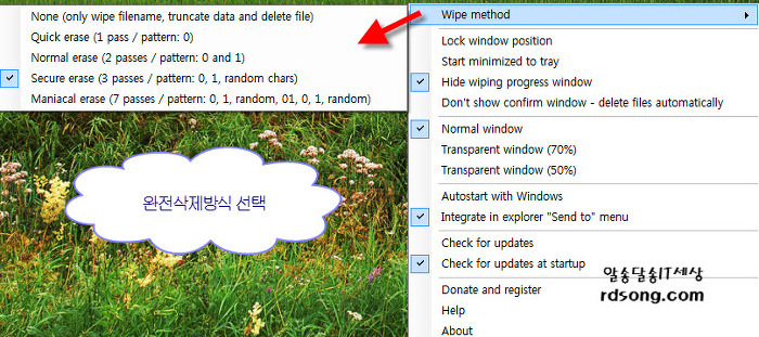 몇가지 되는데, 개인적으로 보안삭제secure erase로 선택했고, 맨마지막 maniacal erase가 가장강력 방식, 휴지통에 넣었을 때 삭제하는 속도도 빠르더군요 단점이 한글 지원이 되지 않아 불편할수 있지만 삭제속도도 빠르것이 일단 성능 만족!