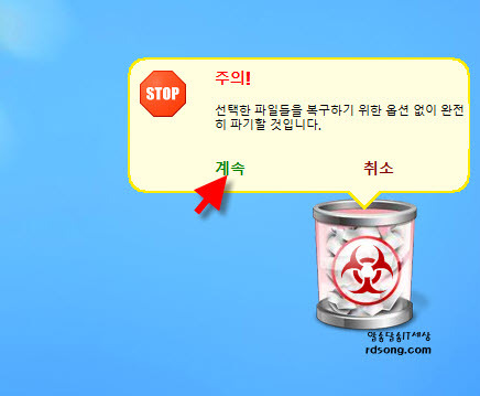 삭제하고 싶은 파일/폴더를 휴지통으로 마우스로 드레그 해 주면 완전하게 삭제되며 설령 삭제된 파일을 복구 유틸로 돌려서 열어본들 파일크기가 1byte로 파일이름은 알수없는 이름으로 바뀌어져 있어서 복구가 불가능합니다