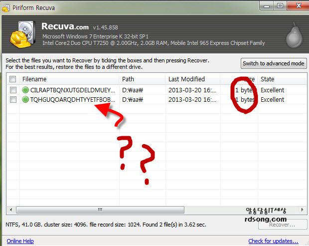 파일이름은 알수없는 이름으로 바뀌어져 있고 파일크기가 1byte로 전혀 복구 할수없는 상태로 만들어져 있는 것을 확인 했슴다